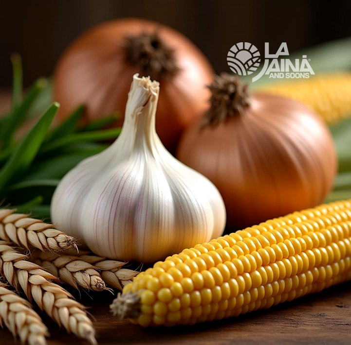Vindem ceapă, usturoi, porumb și grâu – produse cultivate cu grijă în ferma noastră.
